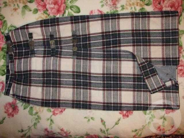 Юбка-конверт сшита в единственном экземпляре по индивидуальному эскизу. Из белого меланжа с сине-красной шотландской клеткой + тонкие серо-голубые и чёрные полосы. Интересный элемент - застёжка на 4 крупных карабина (необычное сочетание фолк-стиля в ткани и милитари в застёжках). Длина - 95 см, объём (размер) можно регулировать. На шёлковой подкладе