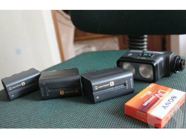 Камера в заводской комплектации+UV фильтр, 3 аккумулятора F970. Камере 2,5 года. Коробка, инструкции, зарядное устройство, шнуры. Накамерный свет Sony HVL 20 DW2. Отличная светочувствительность, устойчивость картинки, все ручные настройки. Сборка-Япония. К камере идет специальная сумка-переноска. Камера отсняла около 100 часов.Работала только с новыми sony DV премиум кассетками.